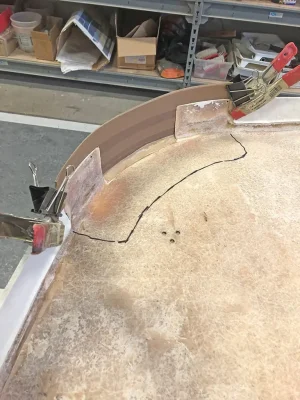 Ремонт яхт епоксидною смолою передбачає використання двокомпонентного структурного клею (смола та затверджувач) для заповнення отворів, ламінування скловолокна та герметизації поверхонь для покращення водостійкості та міцності. Основні кроки включають очищення та шліфування поверхні, точне змішування (часто 2:1 або 4:1) та нанесення валиками, пензлями або шпателями. Епоксидна смола затвердіває з рідкого стану до твердого, придатного для ремонту при температурі 40°F і вище, що дозволяє шліфувати та фарбувати. Епоксидна смола може бути досить крихкою, тому між шарами тканих або зшитих тканин зазвичай використовується хаотично орієнтоване нарізане скловолокно, щоб навантаження можна було ефективно передавати між шарами конструкційного скловолокна. Бо без нарізаного скловолокна з часом у смолі між шарами конструкційного скловолокна можуть утворюватися мікротріщини.