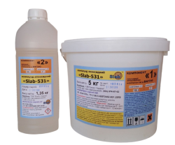 Властивості продукту: КЕ «Slab-531» характеризується високою адгезією до металів, скла, бетону, а також механічною міцністю, тепло-, водо- і хімічною стійкістю, хорошими діелектричними показниками. КЕ «Slab-531» здатний твердіти при температурі від +15°С до +40°С.