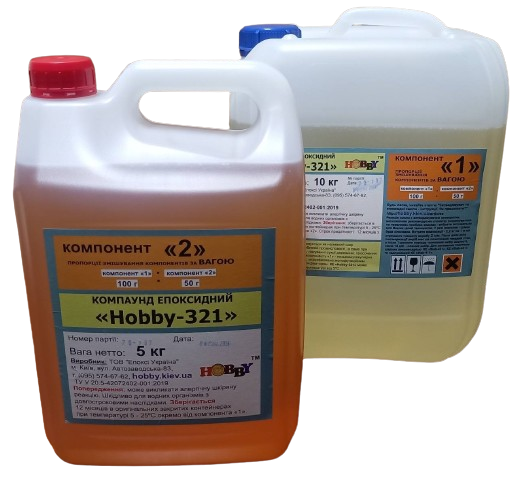 Характеристика: у складі КЕ «Hobby-321» компонент “1” – низькомолекулярна епоксидна смола, модифікована монофункційним хімічно-активним пластифікатором; компонент “2” – модифікований аміновий затверджувач на основі циклоаліфатичного поліаміну рожевого кольору.