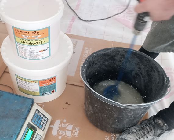Товстими шарами даний комплект (композиція) не заливається – може закипіти, деформуватися. Вихід – заливати шарами по 2-5 мм. Пропорція змішування вказана на тарі компонентів. А саме 50:100, де 100 гр – це компонент “1”, а 50 гр – компонент “2”. Змішувати компоненти протягом 2-3 хвилин. Бажано перелити в нову чисту ємність та знов перемішати протягом 1 хвилини.