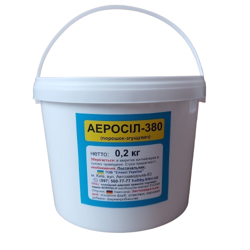 Аеросіл-380 – наповнювач в епоксидну смолу для створення шпаклівки. Після згущення смола стає білою (або тілесного кольору) – не прозора!
